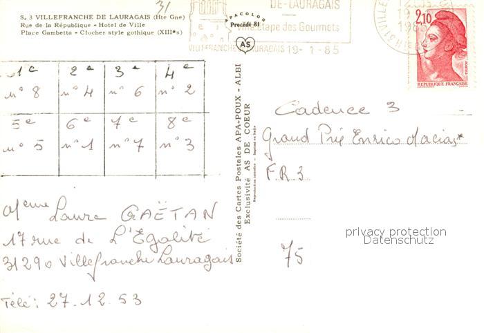 13231659 carte postale Villefranche-de-Lauragais Rue de Republique Hotel de Ville postalisch gelaufen Erhaltung siehe scans [NatalD47] KatCode: 11170031331582