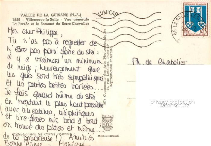 carte postale Villeneuve la Salle Vue Generale La Ravée et Sommet de Serre Chevalier en hiver postalisch gelaufen Erhaltung siehe scans [FriedD77]