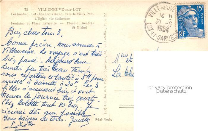 13577276 carte postale Villeneuve-sur-Lot Les bords du Lot vers le vieux Pont Eglise Ste Catherine Fontaine et Place Lafayette Plage du General St Michel postalisch gelaufen Erhaltung siehe scans [WerneD78] KatCode: 11170047347323