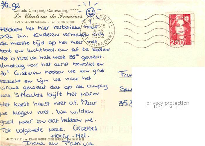 12898043 carte postale Villereal Castels Camping Le Chateau de Fonrives Fliegeraufnahme postalisch gelaufen Erhaltung siehe scans [FriedD77] KatCode: 11170047347324