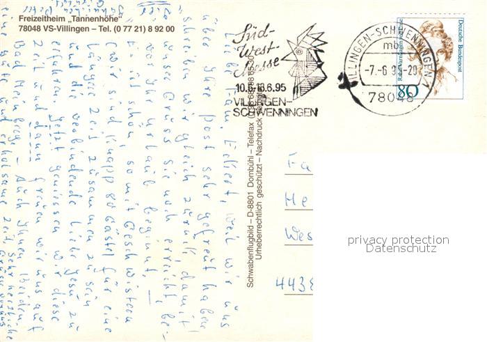 73321834 alte Postkarte Villingen-Schwenningen Fliegeraufnahme Freizeitheim Tannenhoehe postalisch gelaufen Erhaltung siehe scans [KathaD81] KatCode: 11110008326074