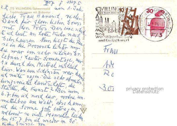 72814492 alte Postkarte Villingen-Schwenningen Trachtenbrunnen mit Bickentor postalisch gelaufen Erhaltung siehe scans [WerneD78] KatCode: 11110008326074