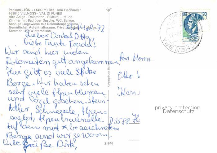 old postcard Villnoess Pension Toni postalisch gelaufen Erhaltung siehe scans [KathaD81]