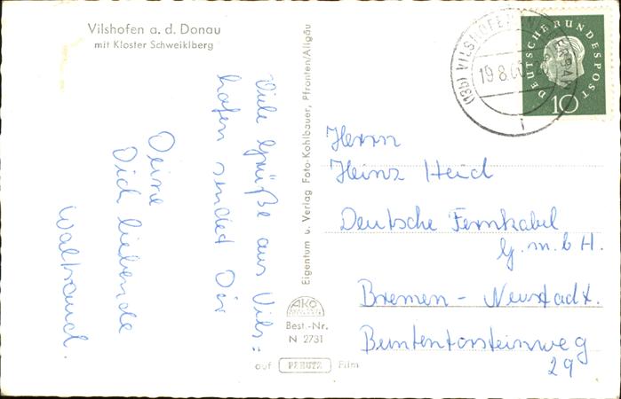 71433278 alte Postkarte Vilshofen Donau Kloster Schweiklberg postalisch gelaufen Erhaltung siehe scans KatCode: 11110009275154