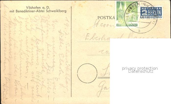 72097295 alte Postkarte Vilshofen Donau mit Benediktiner Abtei Schweiklberg postalisch gelaufen Erhaltung siehe scans KatCode: 11110009275154