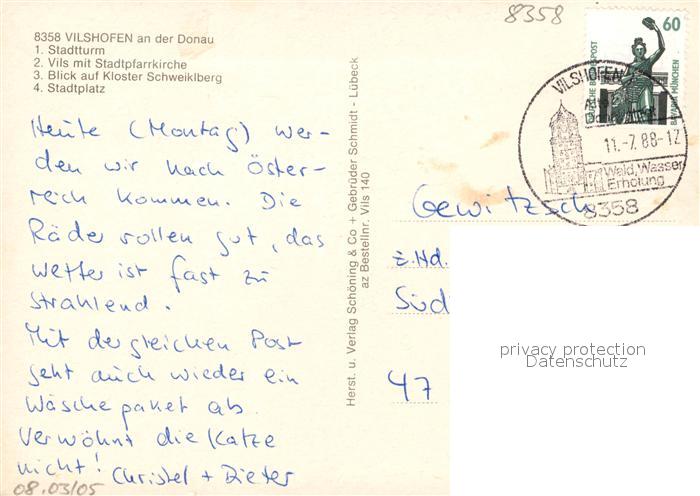73059338 alte Postkarte Vilshofen Donau Stadtturm Vils mit Stadtpfarrkirche Kloster Schweiklberg Stadtplatz postalisch gelaufen Erhaltung siehe scans [WerneD78] KatCode: 11110009275154