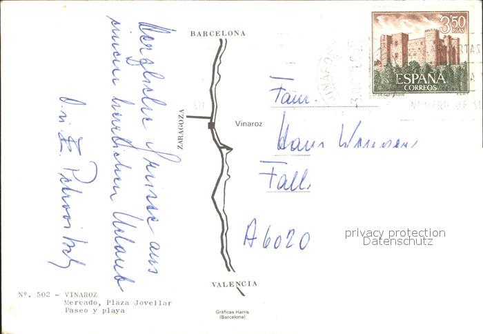 old postcard Vinaroz Mercado Plaza Jovellar Paseo y Playa postalisch gelaufen Erhaltung siehe scans