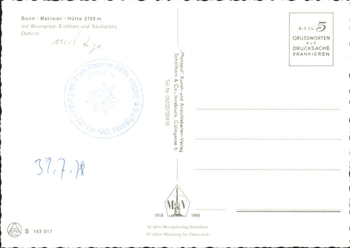 71431750 Virgen Bonn Matreier Huette mit Wunspitze Eichham Saeulspitze Venedigergruppe postalisch nicht gelaufen Erhaltung siehe scans KatCode: 11390333070734