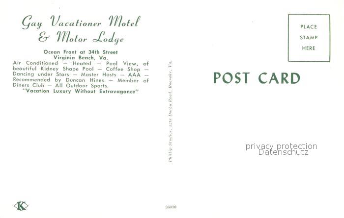 72989543 Virginia Beach Gay Vacationer Motel and Motor Lodge postalisch nicht gelaufen Erhaltung siehe scans [WerneD78] KatCode: 14140490000000