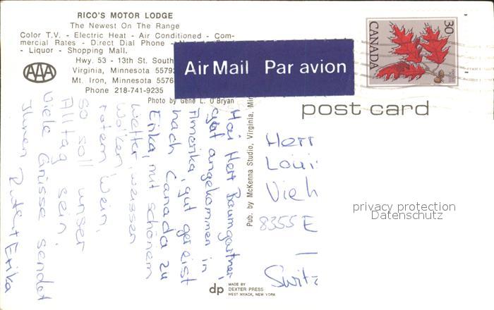 12020988 old postcard Virginia Minnesota Rico’s Motor Lodge postalisch gelaufen KatCode: 14140250000000
