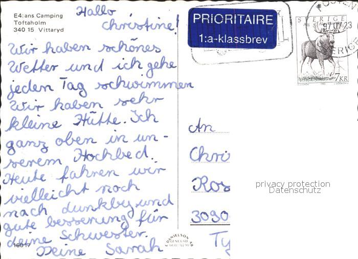 old postcard Vittaryd Ljungby E4 ans Camping Toftaholm Bootspartie Strand Spielplatz postalisch gelaufen Erhaltung siehe scans