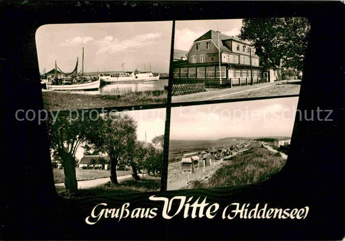 72728567 alte Postkarte Vitte Hiddensee Hafen Fischkutter Faehre FDGB Erholungsheim Strand Promenade postalisch gelaufen Erhaltung siehe scans [FriedD77] KatCode: 11110013061017