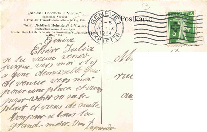 13960888 alte Postkarte Vitznau Witznau Vierwaldstaettersee LU Schloessli Hohenfels 1. Preis der Franziskusheimlotterie in Zug 1914 Kuenstlerkarte postalisch gelaufen Erhaltung siehe scans [FriedD77] KatCode: 11470120385892