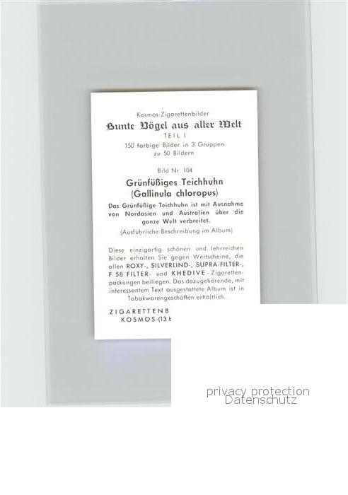 72145129 Voegel Birds Oiseaux Uccelli Pajaros– Gruenfuessiges Teichhuhn Kosmos-Zigarettenbilder Bild Nr. 104 postalisch nicht gelaufen Keine Postkarte (siehe scan) Erhaltung siehe scans Keine Postkarte (siehe scan) Paol Katcode 22540000003500
