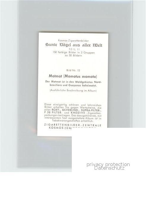 72145107 Voegel Birds Oiseaux Uccelli Pajaros– Motmot Kosmos-Zigarettenbilder Bild Nr. 15 postalisch nicht gelaufen Keine Postkarte (siehe scan) Erhaltung siehe scans Keine Postkarte (siehe scan) Paol Katcode 22540000003500