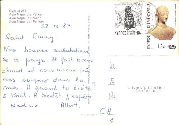 72533089 Voegel Birds Oiseaux Uccelli Pajaros– Pelikan Ayia Napa Griechenland postalisch gelaufen Erhaltung siehe scans [PaolaD17 kt100box] alte Postkarte Paol Katcode 22540000003500