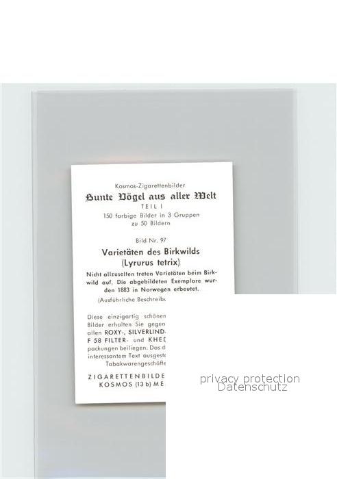 72144473 Voegel Birds Oiseaux Uccelli Pajaros– Varietaeten des Birkwilds Kosmos-Zigarettenbilder Bild Nr. 97 postalisch nicht gelaufen Keine Postkarte (siehe scan) Erhaltung siehe scans Keine Postkarte (siehe scan) Paol Katcode 22540000003500