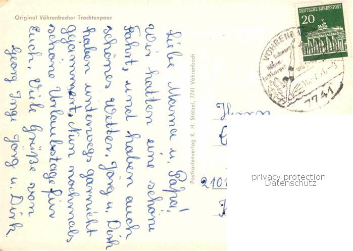 72875068 alte Postkarte Voehrenbach Original Voehrenbacher Trachtenpaar Schwarzwald postalisch gelaufen Erhaltung siehe scans [FriedD77] KatCode: 11110008326068