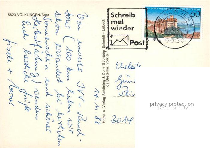 73174114 alte Postkarte Voelklingen Rathausstrasse Fussgaengerzone Brunnen Schillerpark postalisch gelaufen Erhaltung siehe scans [FriedD77] KatCode: 11110010041519
