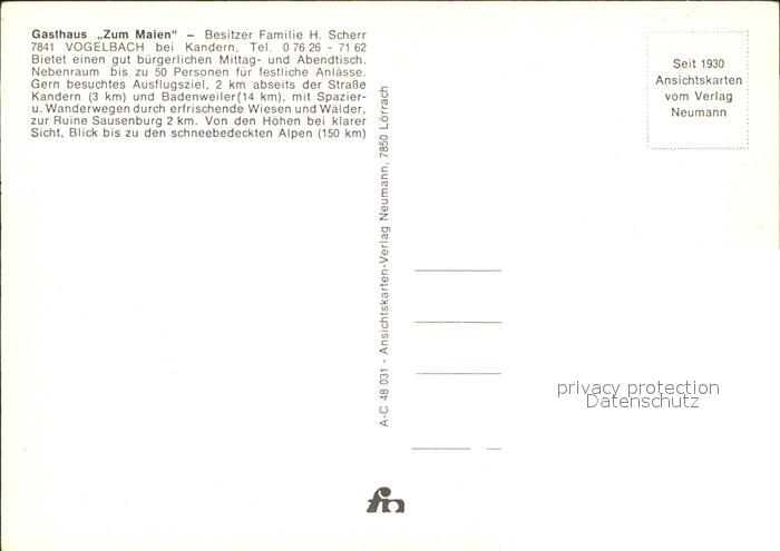 71830927 Vogelbach Malsburg-Marzell Gasthaus zum Maien postalisch nicht gelaufen KatCode: 11110008336104