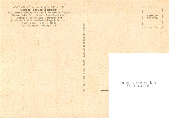 73634665 Vogt Gasthof Pension Paradies Kegelbahn postalisch nicht gelaufen Erhaltung siehe scans [FriedD77] KatCode: 11110008436078