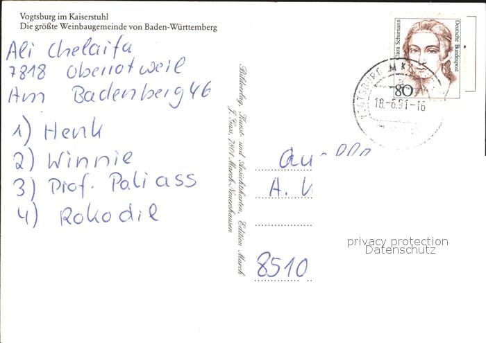 72543111 alte Postkarte Vogtsburg Kaiserstuhl Oberbergen Bickensohl Achkarren Oberrotweil Schelingen Burkheim postalisch gelaufen Erhaltung siehe scans [KathaD75 kv015box] KatCode: 11110008315133