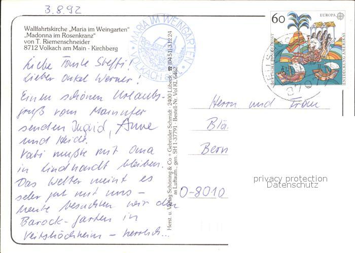 72369797 alte Postkarte Volkach Wallfahrtskirche Maria im Weingarten Fliegeraufnahme postalisch gelaufen Erhaltung siehe scans KatCode: 11110009675174