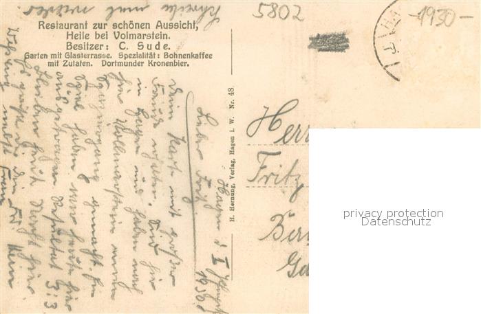 73708765 alte Postkarte Volmarstein Restaurant Zur schoenen Aussicht Terrasse postalisch gelaufen Erhaltung siehe scans [LiesaD40] KatCode: 11110005954032
