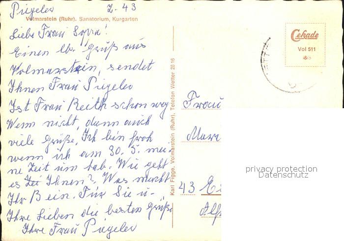 72425679 alte Postkarte Volmarstein Sanatorium Kurgarten postalisch gelaufen Erhaltung siehe scans KatCode: 11110005954032