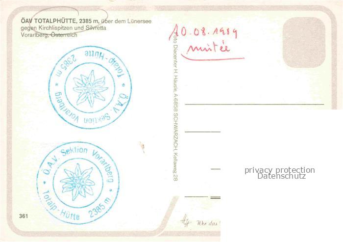 74042384 Vorarlberg AT oeAV Totalphuette ueber dem Luenersee mit Kirchlispitzen und Silvretta postalisch nicht gelaufen Erhaltung siehe scans [WerneD78] KatCode: 11390342080207