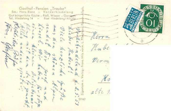 73940717 alte Postkarte Vorderhindelang Bad Hindelang Bayern Gasthof Pension Traube postalisch gelaufen Erhaltung siehe scans [WerneD78] KatCode: 11110009780123