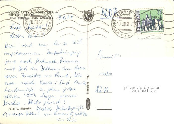 old postcard Vysoke Tatry Hotel Bellevue postalisch gelaufen Erhaltung siehe scans