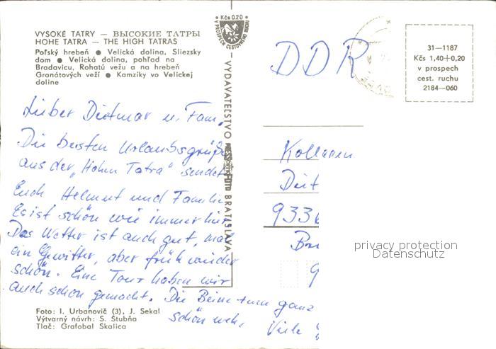 old postcard Vysoke Tatry Polsky hreben Velicka dolina Sliezsky dom Granatovych vezi kamziky vo Velickej doline postalisch gelaufen Erhaltung siehe scans