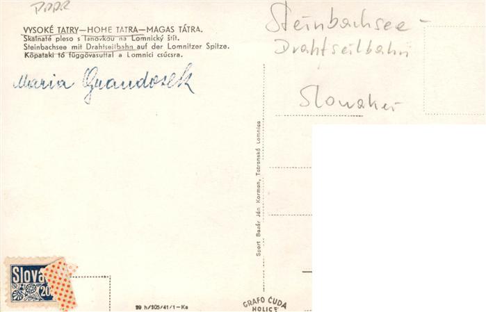 old postcard Vysoke Tatry SK Steinbachsee mit Drahtseilbahn auf der Lomnitzer Spitze postalisch gelaufen Erhaltung siehe scans [WerneD78]