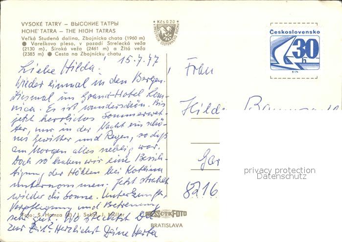 Vysoke Tatry the high Tatras Velka Studena dolina Vareskovo pleso v pozadi Strelecka veza Siroka veza a Zita veza Cesto na Zbojnicku chatu postalisch nicht gelaufen Erhaltung siehe scans