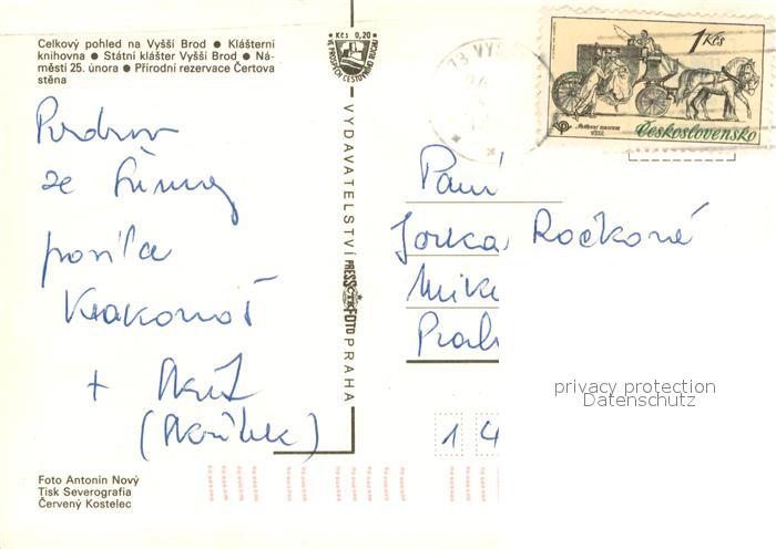 old postcard Vyssi Brod Panorama Klasterni knihovna Statni klaster Vyssi Brod Namesti 25 unora Prirodni rezervace Certova stena postalisch gelaufen Erhaltung siehe scans [WerneD78]