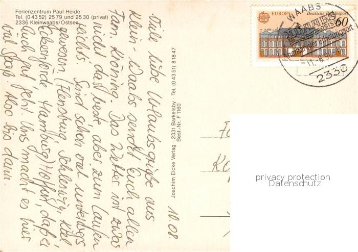73672419 alte Postkarte Waabs Ostsee Camping Ferienzentrum Paul Heide Strand Hallenbad Minigolf Fliegeraufnahme postalisch gelaufen Erhaltung siehe scans [FriedD77] KatCode: 11110001058166