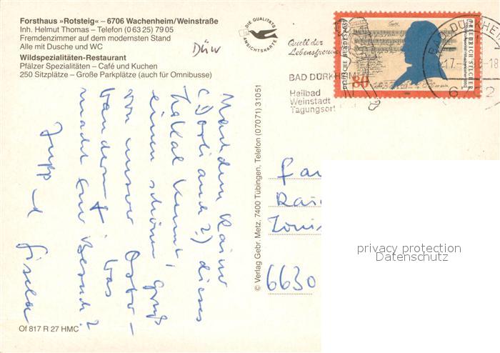 73745904 alte Postkarte Wachenheim Weinstrasse Forsthaus Rotsteig Wildspezialitaeten Restaurant Terrasse Gastraeume postalisch gelaufen Erhaltung siehe scans [FriedD77] KatCode: 11110007332046