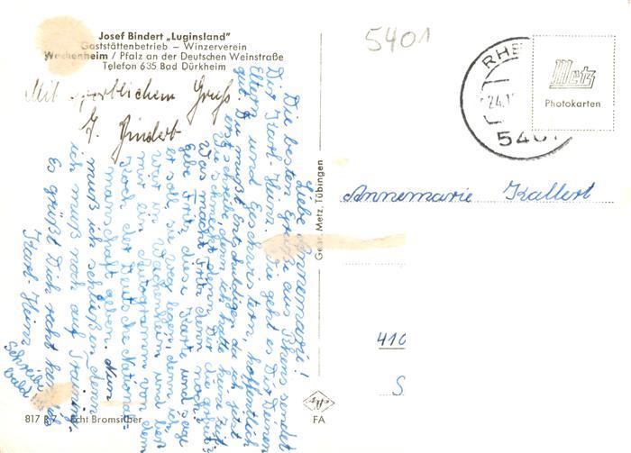 73875861 alte Postkarte Wachenheim Weinstrasse Winzerverein Hausgaststaette Luginsland Gastraeume Burgruine Bromsilber postalisch gelaufen Erhaltung siehe scans [FriedD77] KatCode: 11110007332046