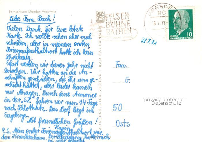 73063353 alte Postkarte Wachwitz Fernsehturm postalisch gelaufen Erhaltung siehe scans [KathaD81] KatCode: 11110014262000