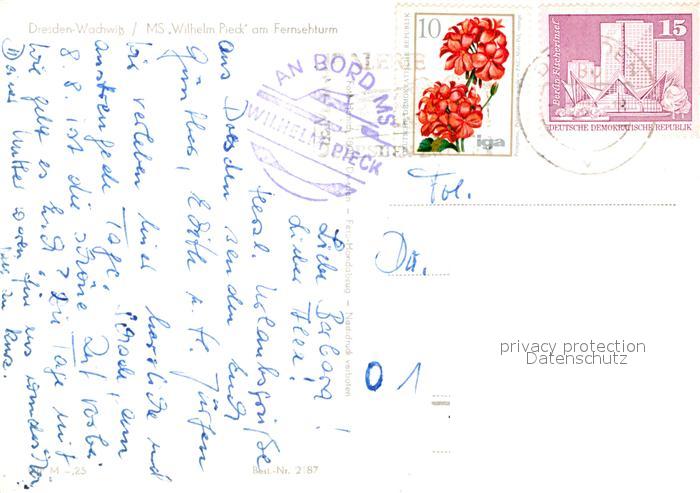 72940684 alte Postkarte Wachwitz MS Wilhelm Pieck Elbe Fernsehturm postalisch gelaufen Erhaltung siehe scans [FriedD77] KatCode: 11110014262000
