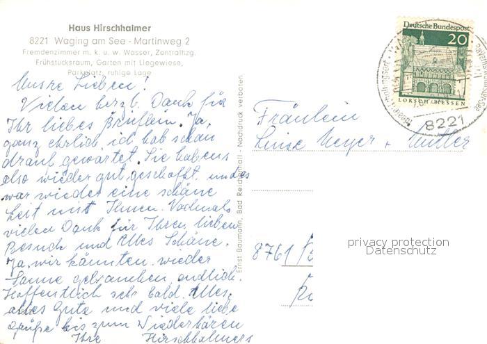 73647289 alte Postkarte Waging See Gaestehaus Pension Haus Hirschhalmer postalisch gelaufen Erhaltung siehe scans [FriedD77] KatCode: 11110009189162