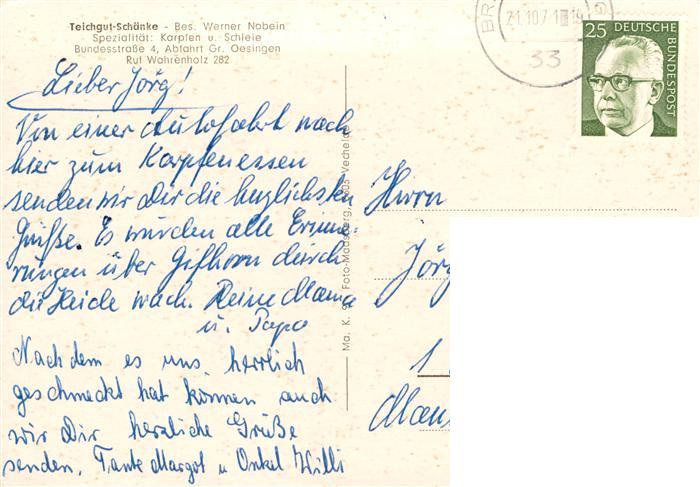 73886438 alte Postkarte Wahrenholz Teichgut-Schaenke Restaurant Teich Holzbruecke postalisch gelaufen Erhaltung siehe scans [FriedD77] KatCode: 11110003151036