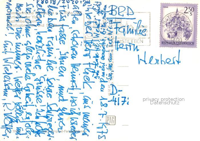 73363544 alte Postkarte Waidhofen Ybbs Partie an der Ybbs Buchenbergheim Forellenbrunnen Stadtturm postalisch gelaufen Erhaltung siehe scans [FriedD77] KatCode: 11390121030301