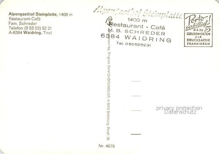 73224073 Waidring Tirol Alpengasthof Steinplatte Bergwandern Alpenflora Landschaftspanorama Alpen Almvieh Kuehe Edelweiss Enzian postalisch nicht gelaufen Erhaltung siehe scans [FriedD77] KatCode: 11390335070419