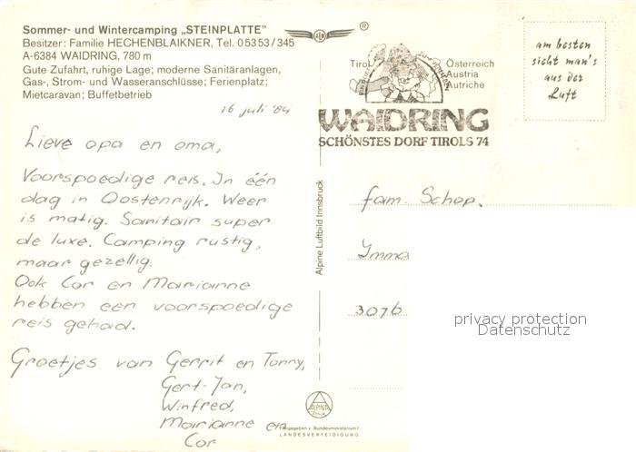 73167435 Waidring Tirol Fliegeraufnahme Camping Steinplatte Familie Hechenblaikner postalisch nicht gelaufen Erhaltung siehe scans [LiesaD40] KatCode: 11390335070419