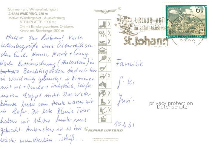 73657386 alte Postkarte Waidring Tirol Steinplatte Panorama Ortskern Fliegeraufnahme Kirche mit Steinberge postalisch gelaufen Erhaltung siehe scans [WerneD78] KatCode: 11390335070419