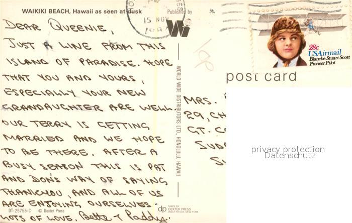 73130683 old postcard Waikiki Beach palmtrees sunset postalisch gelaufen Erhaltung siehe scans [FriedD77] KatCode: 14140130000000