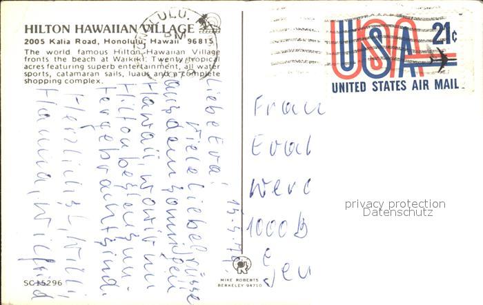 72161936 old postcard Waikiki Hilton Hawaiian Village Hotel Beach aerial view postalisch gelaufen Erhaltung siehe scans KatCode: 14140130000000