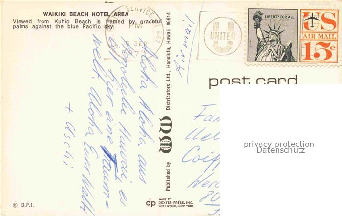 74121193 old postcard Waikiki Honolulu Hawaii USA Beach Hotel Area Kuhio Beach postalisch gelaufen Erhaltung siehe scans [WerneD78] KatCode: 14140130000000